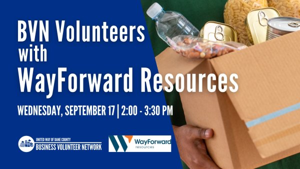 United Way's Business Volunteer Network is partnering with WayForward Resources! During our time together, we will tour of one of the largest food pantries in Dane County, hear presentations on housing stability and food security, and help where needed (ie, sorting and re-packing products, light cleaning, basic yard work, outdoor garden tasks, help in the Clothing Center, etc).